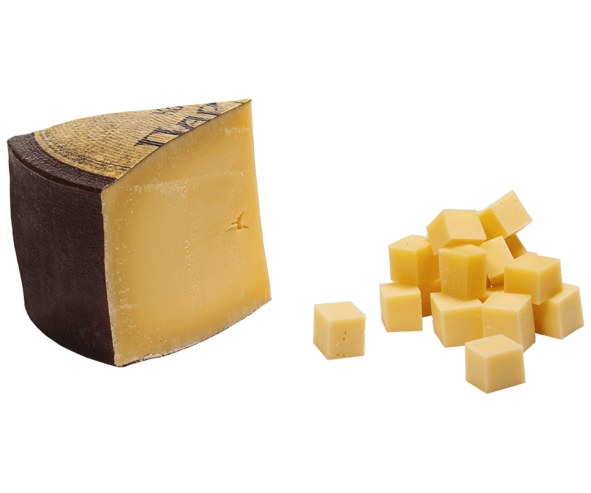 "Пармезан" - это твердый сыр, изготовленный из коровьего молока, который готовится исключительно из натуральных компонентов, благодаря чему обладает насыщенным вкусом и ароматом. Срок созревания этого сыра 6 и 12 месяцев. В нем отчетливо слышен вкус молока с нотками трав и цветов, имеется сливочный аромат и деликатный сладко-солоноватый вкус. В процессе более длительного созревания сыр приобретает уникальный сложный вкус, сочетающий в себе оттенки фруктов и орехов, а также ярко-выраженный аромат, и более ломкую кристаллическую структуру, по сравнению с молодым 6-ти месячным. Этот сорт сыра по праву считается королем среди всех твердых сыров и "must-have" на кухне у любой хорошей хозяйки. Сыр прекрасен во всех блюдах, а не только как яркое дополнение итальянской кухни (пиццы, пасты), и конечно его принято употреблять в пищу самостоятельно. Лучшее сочетание для него - сочные фрукты (яблоки, груши, дыня), а также спелая клубника. Идеальная винная пара - легкое фруктовое красное вино. Нужно отметить, что это еще и кладезь нутриентов и витаминов: Ca (кальций), P (фосфор), K (калий) витамины: A, B6, B2, B12, C, E.
