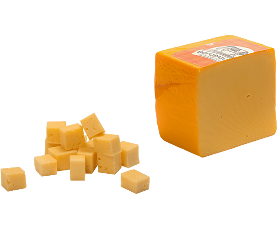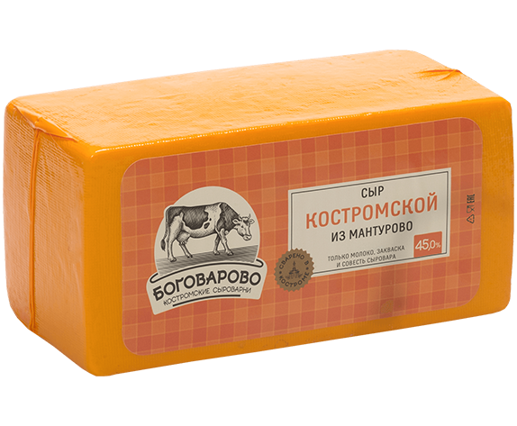 Сыр "Костромской", так хорошо известный в каждом доме на территории России и постсоветского пространства. Сыр изготавливается из пастеризованного коровьего молока с внесением молокосвертывающего сычужного фермента и закваски мезофильных молочнокислых бактерий. Этот полутвердый сыр с небольшим количеством натуральных глазков ровной округлой формы (образующихся в результате деятельности газообразующих молочнокислых бактерий), отличающийся эластичной текстурой и кислосливочным вкусом с легкой пикантностью. Этот сыр хорошо плавится и подходит как для бутербродов, так и для различных блюд.