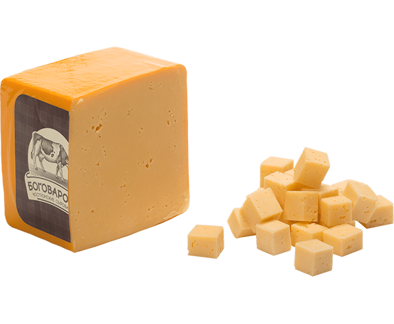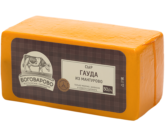 "Гауда" - полутвердый сыр голландской группы, производится из цельного коровьего молока. Этот сыр с плотной консистенцией и небольшим количеством маленьких круглых глазков. Сырное тесто имеет приятный желтый цвет. Это молодой сыр, зреющий всего 4 недели. Отличается свежим сливочным вкусом с легкой кислинкой и полутвердым тестом. Жирность составляет 50%.